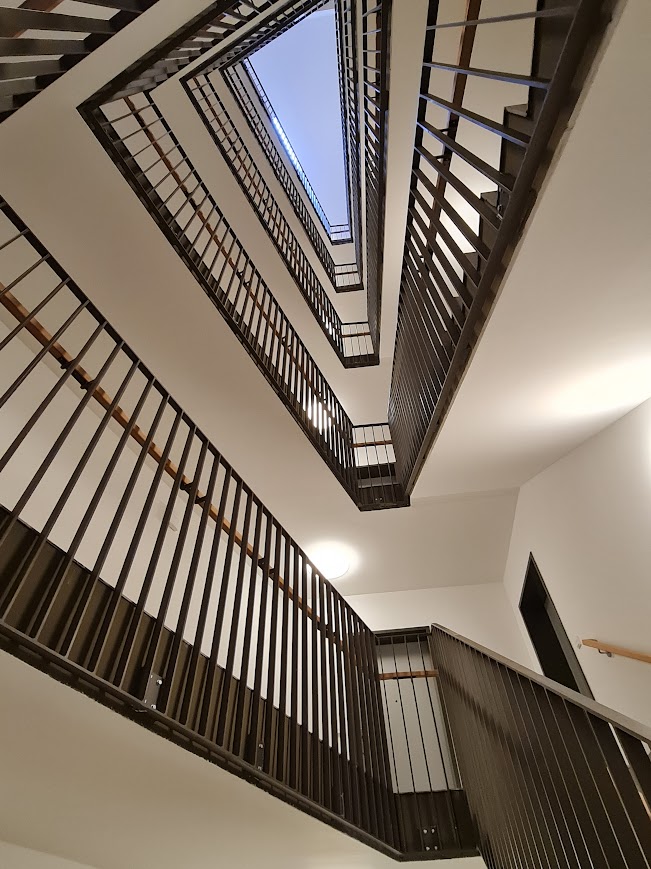Črne balkonske ograje s svojo mrežasto zasnovo ustvarjajo preprost in eleganten videz, ki se lepo sklada z zasnovo soseske, hkrati pa omogočajo zračnost in odprtost prostora. Notranje ograje na stopniščih pa so izdelane robustno in premišljeno, z namenom zagotavljanja dolge življenjske dobe in varne uporabe.